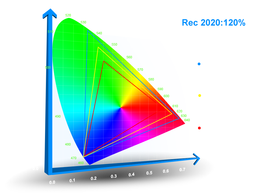 2. 2、更大色域( 色域值达120% Rec.2020,165% DCI-P3,210% Rec.709)