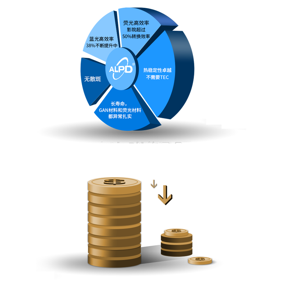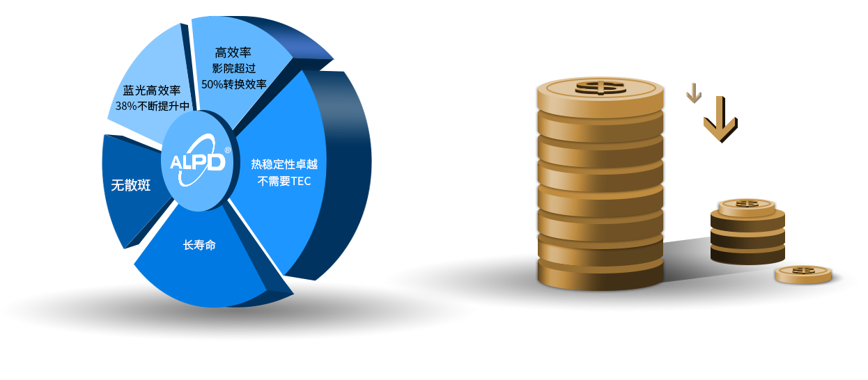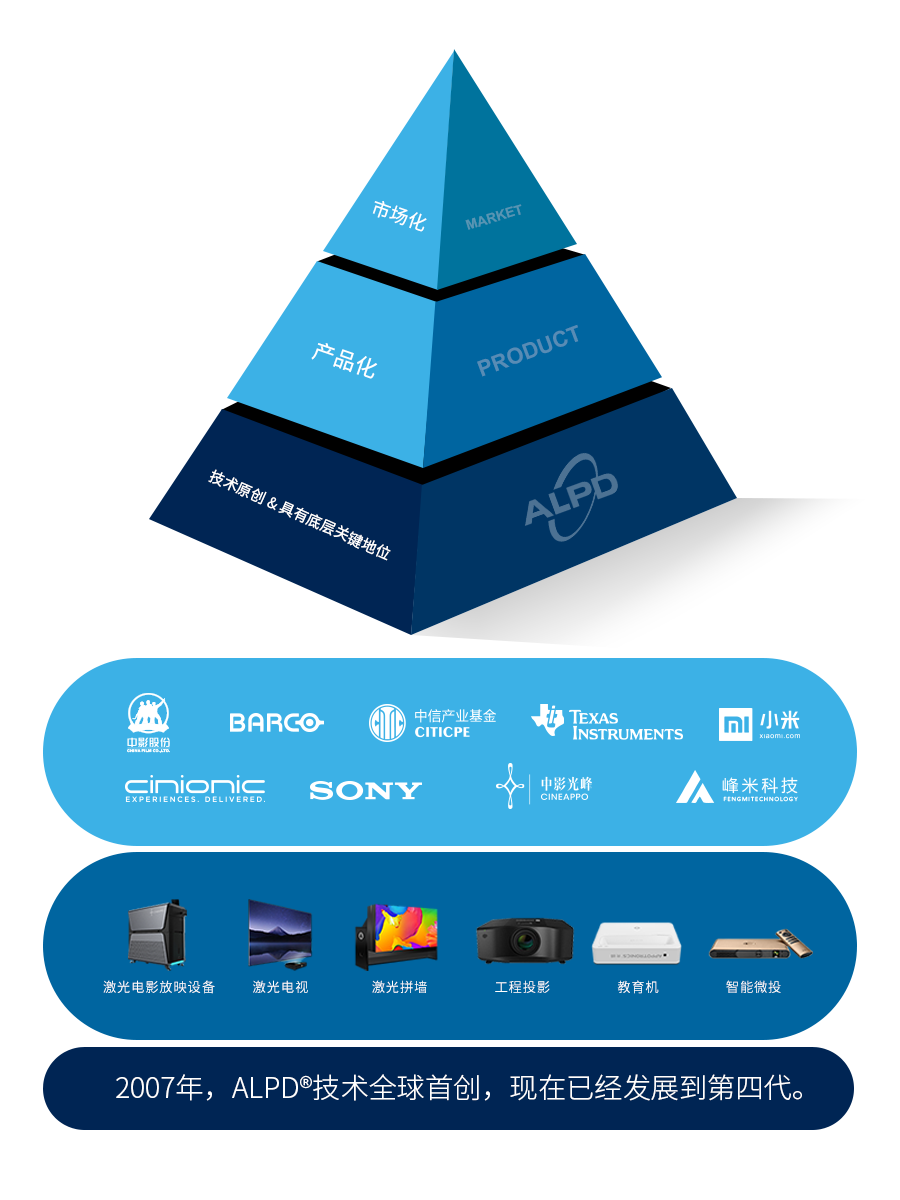 ALPD技术敏锐地察觉了激光技术结合稀土材料在高亮度投影光源上的可行性,创造性地提出了ALPD技术架构,实现了具有了低成本、高亮度、广色域、无散斑等特点的激光光源,革命性地解决了激光显示产业化遇到的困难,实现了激光技术的民用化,逐步应用于显示、照明等。