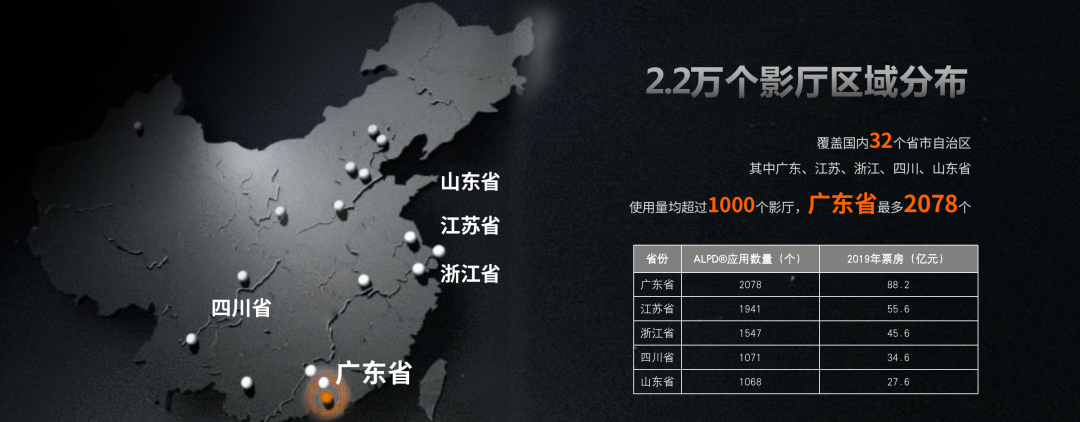 所谓“高亮版”影片,即在ALPD放映标准下进行调色增亮,并专门针对满足亮度标准的ALPD激光放映设备提供,从而实现更好的放映效果。其最终的亮度是普通影片的180%,可呈现更多的色彩层次,更清晰的画面细节。该版本也是当前市场上第一个让激光放映机真正放映激光电影的版本,可以说是为激光放映设备量身定制。目前,已经采用必一运动科技ALPD激光放映技术的22000个影厅覆盖全国众多省份,其中广东、江苏、浙江、四川、山东的影厅数量位列前五,安装量均在1000以上。其中广东已超过2000个。据行业统计显示,2019年以上五个省份为票房Top5。